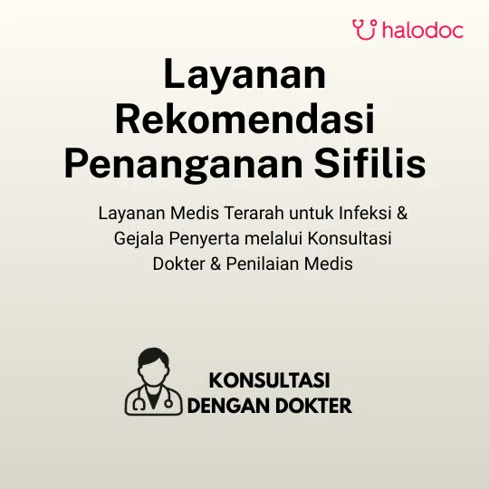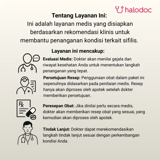 Rekomendasi Penanganan Sifilis merupakan layanan yang disiapkan berdasarkan rekomendasi tenaga medis untuk membantu penanganan kondisi terkait sifilis sesuai arahan dokter. Penggunaan obat dalam paket ini dilakukan berdasarkan penilaian medis, dan resep akan diproses oleh apotek setelah dokter memberikan persetujuan.