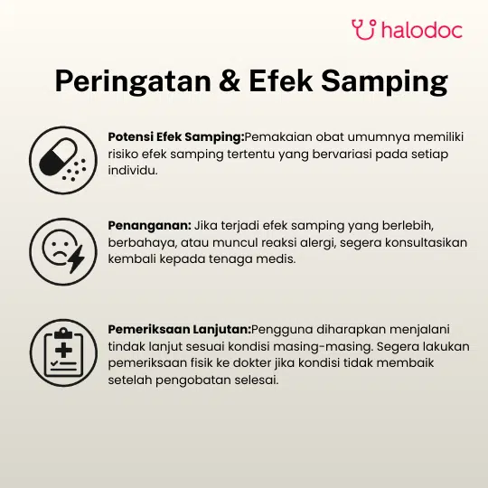 Pemakaian obat umumnya memiliki efek samping tertentu dan sesuai dengan masing-masing individu. Jika terjadi efek samping yang berlebih dan berbahaya, harap konsultasikan kepada tenaga medis.
