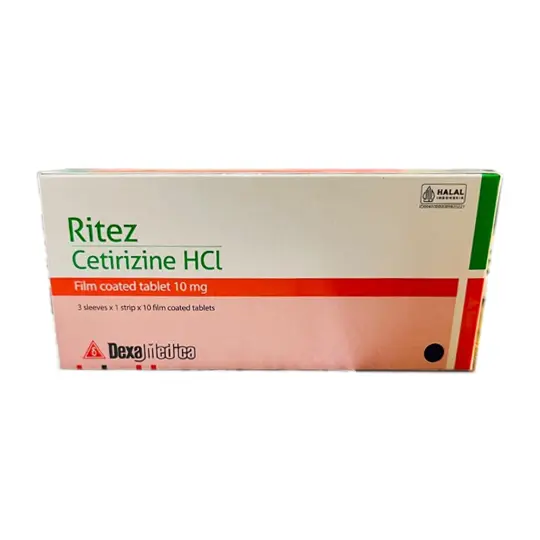 RITEZ mengandung cetirizine hidroklorida, suatu agen antihistamin generasi kedua yang mekanisme kerjanya melibatkan antagonisme selektif terhadap reseptor histamin H1 perifer. Indikasi penggunaan obat ini mencakup penanganan simptomatik berbagai manifestasi alergi, seperti rinitis alergi, baik musiman maupun perenial, yang ditandai dengan bersin, rinore, kongesti nasal, pruritus okular, dan lakrimasi. Selain itu, Ritez juga efektif untuk meredakan pruritus yang terkait dengan urtikaria kronis idiopatik. Dengan menghambat ikatan histamin pada reseptornya, cetirizine secara efisien mereduksi respons inflamasi alergi, memberikan pemulihan dari gejala-gejala tersebut dengan profil sedasi yang lebih rendah dibandingkan antihistamin generasi sebelumnya. Dalam penggunaan obat ini harus SESUAI DENGAN PETUNJUK DOKTER.