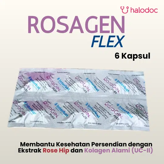 ROSAGEN FLEX 6 KAPSUL adalah suplemen nutrisi yang ditujukan untuk mendukung kesehatan dan fleksibilitas sendi.<br><br>Informasi Umum Terkait Kandungan:* Mengandung tiga komponen utama:<br>1. Rosehip Extract: Dipercaya mengandung senyawa aktif seperti galactolipid yang memiliki sifat anti-inflamasi alami, membantu mengurangi nyeri dan kekakuan sendi.<br>2. Collagen Hydrolysate: Menyediakan peptida kolagen, "blok bangunan" utama untuk regenerasi tulang rawan sendi.<br>3. Vitamin C: Kofaktor penting dalam sintesis kolagen di dalam tubuh.<br>*Informasi ini bersifat edukatif dan tidak dimaksudkan sebagai klaim manfaat langsung dari produk.