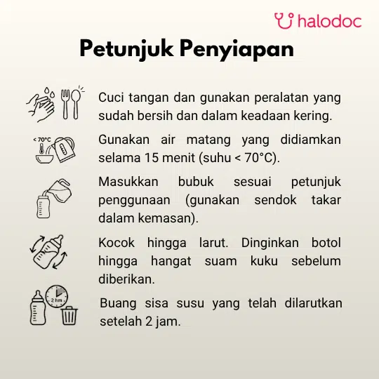 Rebus air minum sampai mendidih selama 5 menit, diamkan sampai suam-suam kuku. Konsultasikan tabel pemberian, tuangkan air suam-suam kuku ke dalam gelas sesuai jumlah yang diamjurkan. GUnakan hanya sendok takar yang tersedia dalam kemasan dan bubuk harus diratakan. Konsultasikan tabel pemberian, tambahkan bubuk susu sesuai takaran yang dianjurkan ke dalam gelas. kocok hingga bubuk larut seluruhnya. Tutup kemasan dengan rapat setiap selesai menggunakan dan simpan ditempat sejuk dan kering. Setelah dibuka, gunakanlah isinya dalam waktu 4 minggu