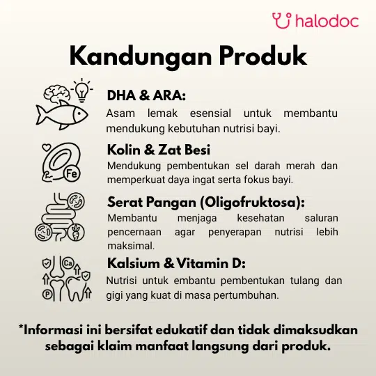 Laktosa, susu bubuk tanpa lemak, minyak-minyak nabati (kelapa sawit, kedelai, kelapa, oleat bunga matahari) mengandung antioksidan (asam askorbat dan tokoferol), mengandung antioksidan (tokoferol), konsentrat whey protein, 11 mineral, pengemulsi (lesitin kedelai dan monogliserida nabati), premiks vitamin dan asam askorbat, asam lemak tak jenuh ganda rantai panjang berasal dari sel tunggal (asan arakidonat (AA), asam dokosaheksanoat (DHA)), pengatur keasaman, perisa artifisial, 5 nukleotida, antioksidan