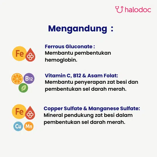Per kapsul : Fe Glukonat 250 mg, Mangan Sulfat 200 mg, Tembaga Sulfat 200 mg, Vitamin C 50 mg, Asam Folat 1000 mg, Vitamin B12 7,5 mg, Sorbitol 25 mg.