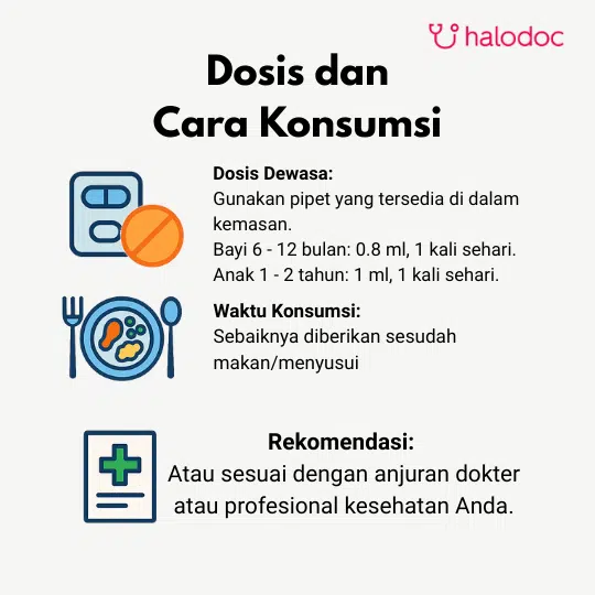 1 x sehari (atau atas petunjuk dokter) kurang dari sama dengan 1 tahun = 1.2 ml 6-12 bulan = 1ml < 6 bulan atas petunjuk dokter