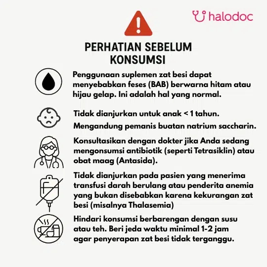 Hindari konsumsi bersamaan dengan teh, kopi, atau susu karena dapat menghambat penyerapan zat besi. Beri jeda waktu 1-2 jam.Tidak dianjurkan pada pasien yang menerima transfusi darah berulang atau penderita anemia yang bukan disebabkan karena kekurangan zat besi (misalnya Thalasemia).Tidak disarankan bagi anak usia kurang dari 1 tahun. Jika gejala tidak membaik, konsultasikan dengan dokter.