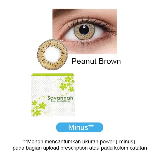 Savannah Peanut Brown merupakan softlense minus dengan masa penggunaan maksimal 6 Bulan. Softlense ini memiliki diameter 15,0 mm dan kadar air 57 %.