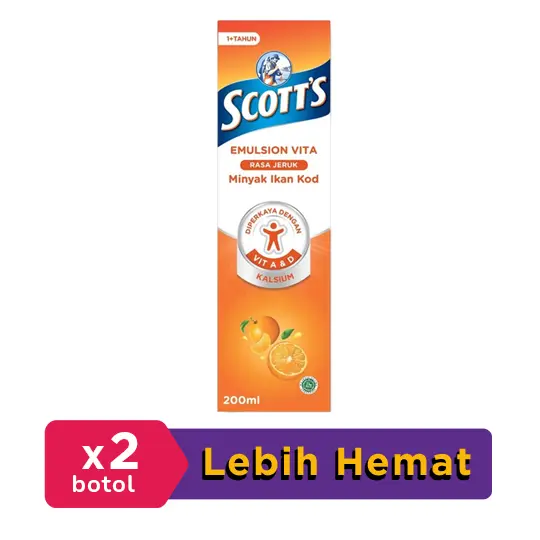 SCOTT'S EMULSION VITA ORANGE mengandung minyak ikan cod, asam lemak omega 3 (DHA+EPA), Vitamin A, dan Vitamin D. Suplemen ini digunakan untuk mendukung fungsi kekebalan tubuh dan penglihatan normal, menjaga kesehatan tulang dan gigi serta bermanfaat untuk pembentukan tulang dan gigi.