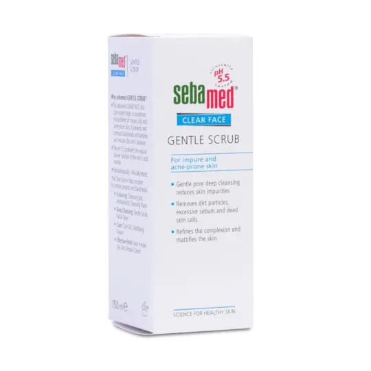 SEBAMED CLEAR FACE GENTLE SCRUB merupakan scrub pembersih untuk kulit berminyak yang berfungsi untuk membebaskan minyak kulit berlebihan yang dapat membentuk potensi jerawat, komedo, dan kotoran kulit. Produk ini mengandung nilai pH 5.5 dan partikel mikro-nya mengupas secara lembut serpihan kulit mati dan memperbaiki kulit yang kusam. Sabun dan alkali membersihkan kulit pori-pori yang jauh dari kelebihan sebum, minyak, dan sisa kotoran sehingga kulit tampak lebih lembut dan terawat.