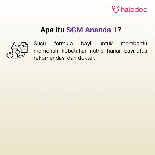 SGM ANANDA 1 (0-6 BULAN) FORMULA BAYI BUBUK merupakan susu formula bayi bubuk complinutri untuk usia 0-6 bulan. Air Susu Ibu (ASI) adalah nutrisi yang terbaik dan penggunaan formula untuk bayi hanya atas rekomendasi Dokter