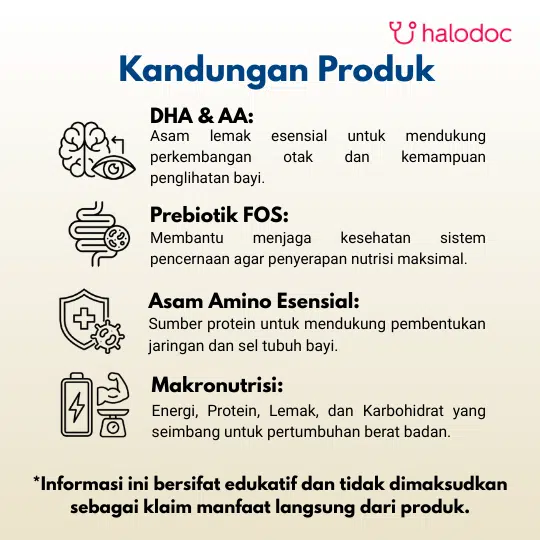 Padatan susu (protein whey, laktosa), Minyak nabati (mengandung lesitin kedelai, antioksidan askorbil palmitat dan campuran tokoferol), Maltodekstrin, Susu bubuk skim, FOS-inulin, Premiks vitamin dan mineral, AA (mengandung antioksidan tokoferol dan askorbil palmitat), DHA (mengandung antioksidan tokoferol).