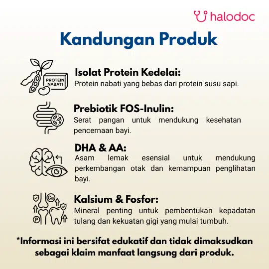 Maltodekstrin, Campuran Minyak Nabati (mengandung antioksidan di alfa tokoferol dan askorbil palmitat), Isolat Protein Kedelai, FOS-Inulin, 12 Mineral, 14 Vitamin, L-Metionin, Pengatur keasaman Asam Sitrat, DHA (mengandung antioksidan tokoferol dan natrium askorbat), AA (mengandung antioksidan tokoferol dan natrium askorbat), Taurin, Kolin, Klorida, Inositol, L-Karnitin