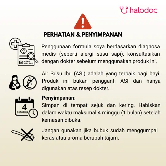 Setelah dibuka, lipat kantung sachet formula soya beberapa kali. Simpan kantung sachet dan sendok takar dalam wadah kering, bersih, sejuk dan tertutup rapat tidak lebih dari 1 (satu) bulan. Jangan diberikan pada bayi Anda, jika terjadi perubahan warna, bau, dan rasa dari bubuk formula soya. Formula soya bayi yang bagus atau susu yang bagus untuk bayi adalah yang tidak mengalami perubahan warna, bau, dan rasa dari bubuk formula soya/susu.