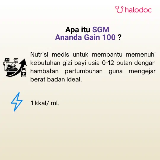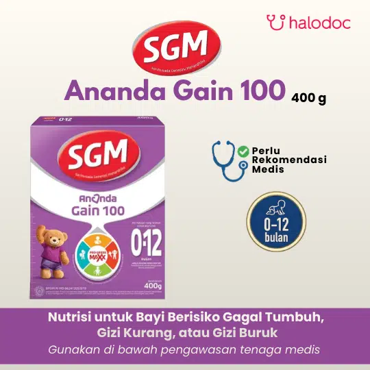 Air susu ibu adalah makanan terbaik untuk bayi Anda. Susu formula bayi bukan pengganti Air Susu Ibu (ASI). ASI Eksklusif diberikan sejak bayi lahir sampai usia 6 bulan dan dilanjutkan sampai dengan bayi berusia 2 (dua) tahun dengan pemberian makanan tambahan yang sesuai. Pemakaian SGM Ananda Gain 100 atas nasehat dokter, bidan dan perawat independent berdasarkan indikasi medis.