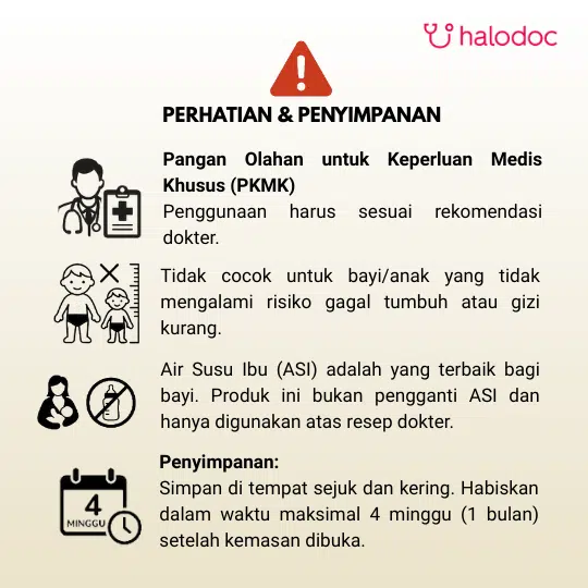 Produk ini merupakan Pangan Olahan Keperluan Medis Khusus untuk Dukungan Nutrisi bagi Anak Berisiko Gagal Tumbuh, Gizi Kurang, dan/atau Gizi Buruk Untuk Bayi Usia 0-12 Bulan. Penggunaan Produk Harus dengan Rekomendasi Dokter.