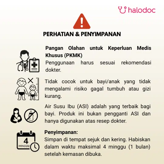 Produk ini merupakan pangan olahan keperluan medis khusus untuk bayi sangat prematur dan / atau bayi berat lahir sangat rendah. Penggunaan produk ini harus dengan rekomendasi dokter sesuai dengan indikasi medis.