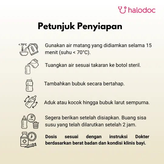 Perhatikan petunjuk penyiapan, penyimpanan dan penggunaan pada kemasan. kesalahan dalam mengikuti petunjuk ini, dapat membuat bayi anda sakit.