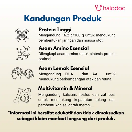 Susu skim bubuk, minyak nabati ( mengandung antioksidan dl- alfa tokoferol dan askorbil palmitat) , Konsentrat protein whey, protein whey terdemineralisasi, maltotrexin, minyak trigliserida rantai rendah , 3 mineral , premiks vitamin dan mineral ( 13 vitamin , 9 mineral , inositol dan taurin ) , AA ( mengandung antioksidan natrium askorbat , tokoferol dan askorbil palmitat) , DHA ( mengandung antioksidan tokoferol , natrium askorbat & askorbil palmitat ) , kolin klorida, L- Karnitin.