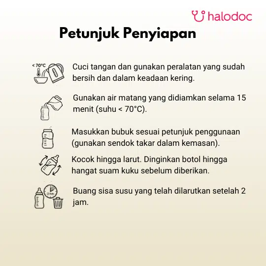 Setelah dibuka, lipat kantung sachet susu beberapa kali. Simpan kantung sachet susu dan sendok takar dalam wadah kering, bersih, sejuk dan tertutup rapat tidak lebih dari 1 (satu) bulan. Jangan digunakan jika terjadi perubahan warna, bau, dan rasa dari bubuk susu.