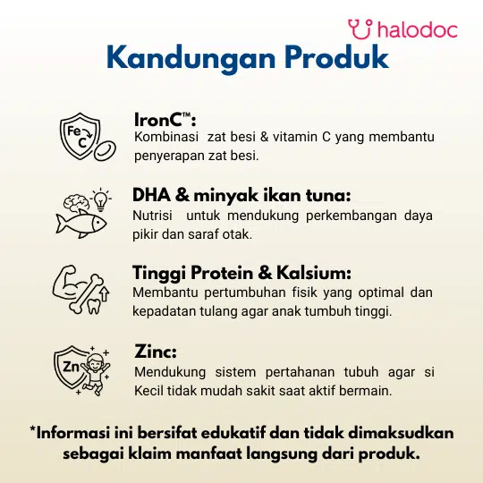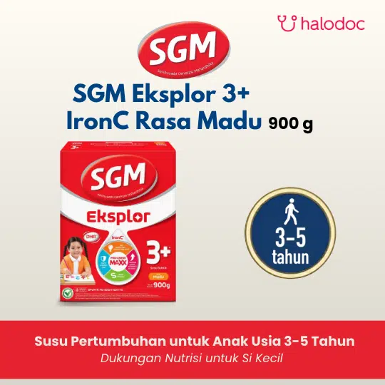 Susu bubuk untuk anak usia 3-5 tahun. SGM Eksplor dengan formula Complinutri membantu melengkapi nutrisi si Kecil karena mengandung zat-zat gizi yang saling mendukung : 1. Minyak Ikan, Omega 3, Omega 6, zat Besi untuk mendukung daya pikir si Kecil 2. Tinggi Protein yang penting untuk mendukung pertumbuhan & perkembangan si Kecil 3. Kalsium & Vitamin D untuk mendukung pembentukan & mempertahankan kepadatan tulang & gigi si Kecil 4. Vitamin C & Zinc untuk mendukung daya tahan tubuh si Kecil 5. Serat Pangan Inulin untuk mempertahankan kesehatan saluran cerna si Kecil.