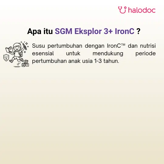 SGM EKSPLOR 3 PLUS dengan formula Complinutri merupakan susu bubuk yang ditujukan untuk anak usia 3-5 tahun. Susu ini dapat membantu melengkapi nutrisi untuk dukung si Kecil memiliki 5 Potensi Prestasi Anak Generasi Maju : Berpikir Kreatif, Bantu Tumbuh Kembang, Supel, Mandiri, Percaya Diri. Formula Complinutri membantu melengkapi nutrisi si Kecil karena mengandung zat-zat gizi yang saling mendukung, diantaranya yaitu: 1. Minyak Ikan, Omega 3, Omega 6, zat Besi untuk mendukung daya pikir si Kecil. 2. Tinggi Protein yang penting untuk mendukung pertumbuhan & perkembangan si Kecil. 3. Kalsium & Vitamin D untuk mendukung pembentukan & mempertahankan kepadatan tulang & gigi si Kecil. 4. Vitamin C & Zinc untuk mendukung daya tahan tubuh si Kecil.