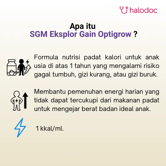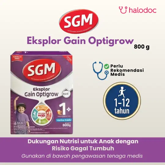 SGM EKSPLOR GAIN OPTIGROW merupakan formula bayi bubuk yang digunakan untuk anak usia di atas 1 tahun dengan indikasi:- Anak berisiko gagal tumbuh- Gizi kurang- Gizi buruk HARUS DENGAN RESEP DOKTER Produk bukan untuk pemberian secara parental.