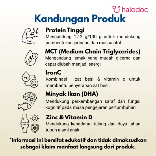Susu bubuk, Maltodekstrin, Campuran minyak nabati (mengandung antioksidan askorbil palmitat), Sukrosa, Minyak trigliserida rantai sedang (MCT), Serat pangan, Mineral, Madu bubuk, Perisa (alami madu, sintetik vanila & alami), Premiks vitamin, Kolin klorida, Minyak ikan (sumber DHA) (mengandung antioksidan natrium askorbat, tokoferol campuran pekat, dan askrobil palmitat), L-Karnitin.
