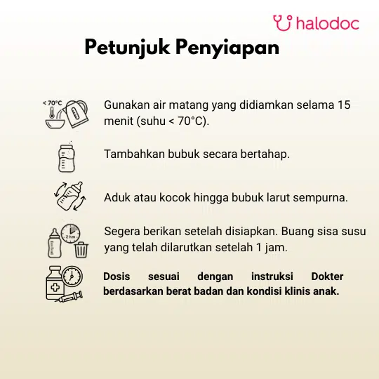 Hanya digunakan sesuai petunjuk dokter atau ahli gizi dan bervariasi sesuai dengan kebutuhan masing-masing individu. Dosis Takaran susu formula bayi dapat dilihat pada Tabel Pemberian Formula.