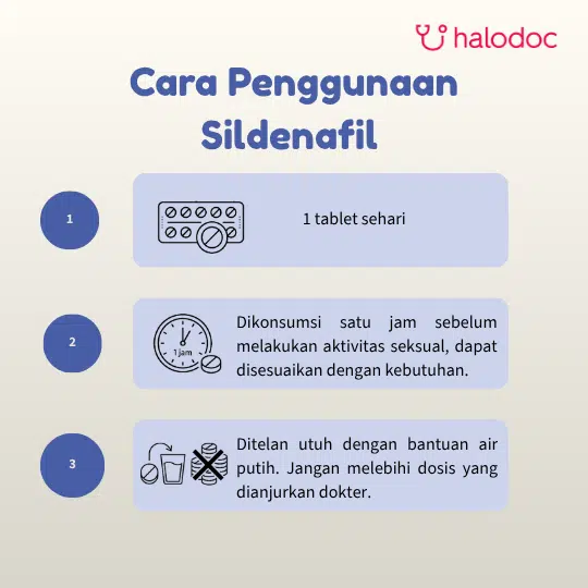 PENGGUNAAN OBAT INI HARUS SESUAI DENGAN PETUNJUK DOKTER. Dewasa : 50 mg diberikan sesuai kebutuhan 1 jam sebelum aktivitas seksual, dapat disesuaikan dengan kebutuhan. Maksimal 100 mg/hari
