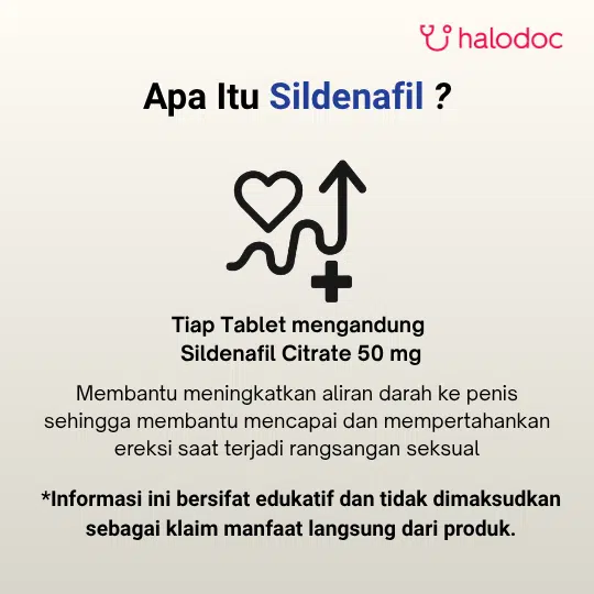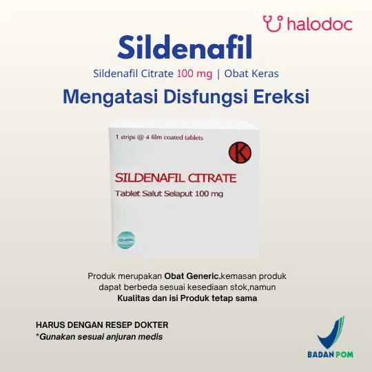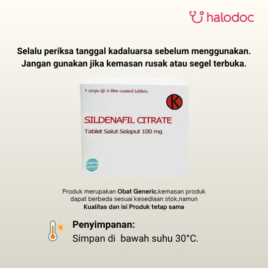 Informasi ini ditujukan bagi Tenaga Medis dan Kesehatan. Obat ini tergolong Obat Keras, sehingga penggunaan obat harus berdasarkan hasil konsultasi atau resep dokter. Informasi Umum Terkait Kandungan: Sildenafil Citrate 100 mg tablet adalah obat yang digunakan untuk mengatasi disfungsi ereksi pada pria dengan meningkatkan aliran darah ke penis sehingga membantu mencapai dan mempertahankan ereksi saat ada rangsangan seksual. Obat ini bekerja dengan menghambat enzim phosphodiesterase-5 (PDE-5), yang memperkuat efek nitric oxide dalam melebarkan pembuluh darah. Sildenafil 100 mg biasanya diminum sesuai kebutuhan sekitar 1 jam sebelum aktivitas seksual, dan tidak lebih dari sekali sehari. Penggunaan dosis ini umumnya diberikan bila dosis lebih rendah kurang efektif, sesuai anjuran dokter. Obat ini tidak boleh dikonsumsi bersama obat nitrat (misalnya untuk angina) karena dapat menyebabkan penurunan tekanan darah yang berbahaya. Efek samping yang dapat muncul meliputi sakit kepala, wajah memerah, pusing, gangguan pencernaan, hidung tersumbat, atau gangguan penglihatan sementara. Segera hubungi tenaga medis jika mengalami ereksi berkepanjangan lebih dari 4 jam, nyeri dada, atau gangguan penglihatan mendadak.