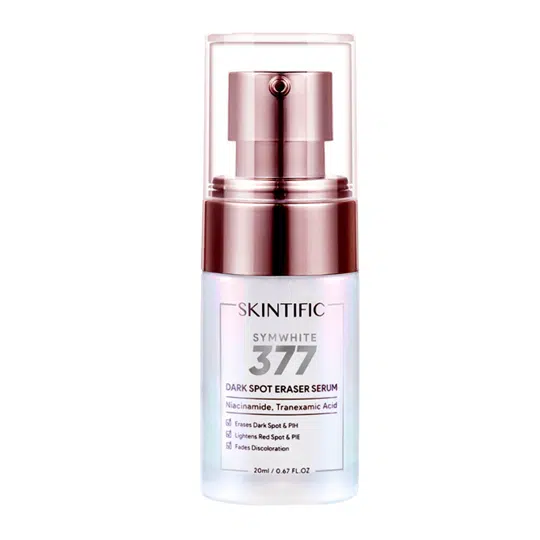 Skintific Symwhite 377 Dark Spot Serum 20 ml merupakan serum yang mengandung SymWhite377 dengan tekstur ringan dan berat molekul rendah, menembus ke lapisan kulit dengan mudah dan efektif mencerahkan noda hitam pada kulit. Kandungan SymWhite377 menekan produksi melanin dan melawan radikal bebas, membantu memudarkan noda hitam dalam 14 hari. Dilengkapi dengan Niacinamide dan Tranexamic Acid yang secara signifikan mengurangi noda hitam membandel, kemerahan, serta mengunci kelembaban kulit. Kandungan yang stabil dan tidak mengiritasi kulit, mencerahkan kulit secara merata untuk kulit tampak lebih muda.