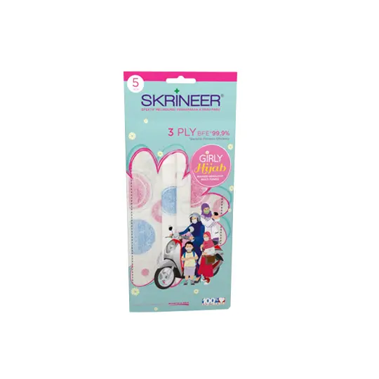 SKRINEER GIRLY HIJAB MASK merupakan masker satu kali pakai yang dapat digunakan untuk melindungi saluran pernapasan dari debu, asap, kuman, cairan dan partikel-partikel lain yang terdapat di udara. Desain masker ini terdiri dari tali pengait yang mengelilingi kepala atau disebut juga headloop sehingga memudahkan konsumen yang menggunakan hijab dalam pemakaiannya.