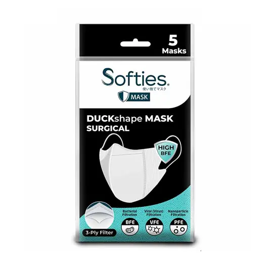 Softies menghadirkan Softies Duckshape Mask Surgical didesign khusus, sehingga tidak menyentuh mulut saat digunakan dan mengikuti bentuk wajah, meltblown dengan high VFE, PFE & BFE (99% filtrasi virus, partikel & bakteri), 3 lapis filter yang berfungsi untuk melindungi dari percikan air & nano partikel.