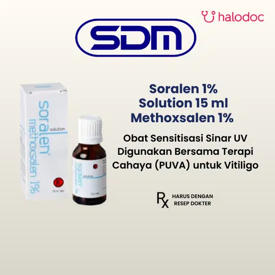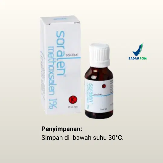 Soralen 1% Solution 15 ml adalah obat yang mengandung Methoxsalen, termasuk golongan Psoralen. Obat ini digunakan secara topikal pada kulit, diikuti dengan paparan radiasi ultraviolet A (UVA) dalam prosedur yang dikenal sebagai PUVA (Psoralen dan UVA), untuk mengobati kondisi kulit tertentu seperti psoriasis, vitiligo, dan mikosis fungoides.