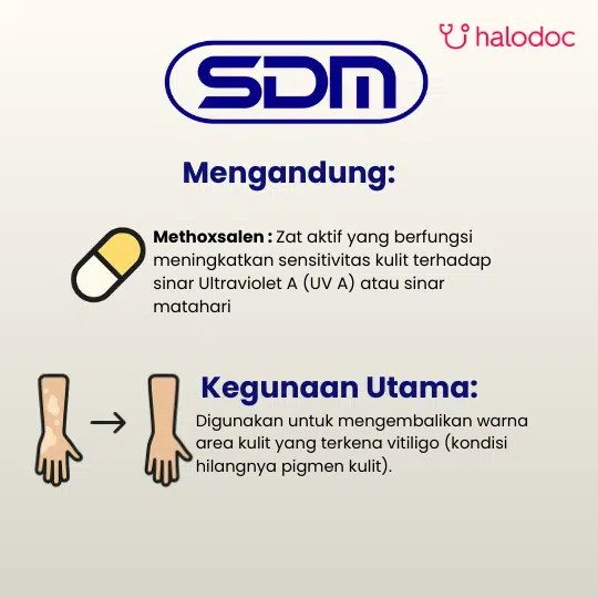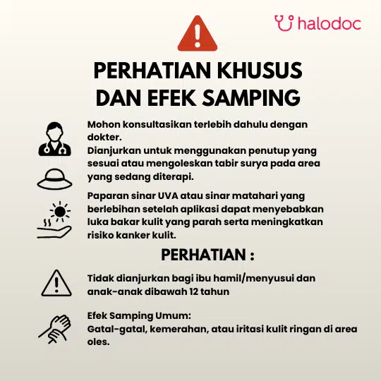 HARUS DENGAN RESEP DOKTER. Sebaiknya produk ini digunakan hanya pada lesi-lesi kecil tertentu, terutama yang dapat dilindungi oleh pakaian atau tabir surya dari pemaparan radiasi UVA. Apabila produk ini digunakan pada terapi vitiligo di daerah wajah atau tangan, beri petunjuk yang jelas pada pasien supaya area yang diterapi tetap terlindung dari sinar dengan cara menggunakan pakaian pelindung atau tabir surya. Area yang diterapi dapat memiliki efek fotosensitivitas yang tinggi selama beberapa hari dan dapat menyebabkan luka bakar yang serius apabila terpapar lagi oleh sinar UV atau sinar matahari.
