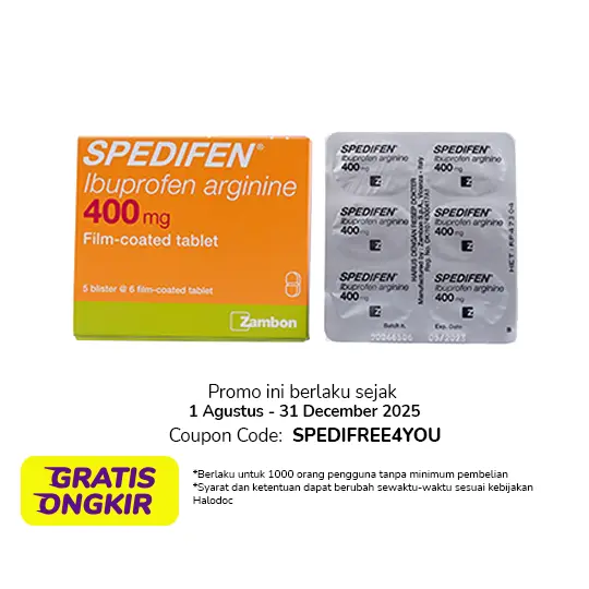 SPEDIFEN adalah obat antiinflamasi non-steroid (OAINS) yang mengandung zat aktif Ibuprofen Arginine 400 mg. Spedifen bekerja dengan menghambat enzim siklooksigenase (COX-1 dan COX-2), yang bertanggung jawab dalam pembentukan prostaglandin, mediator peradangan, nyeri, dan demam. Oleh karena itu, obat ini efektif digunakan untuk meredakan nyeri akut ringan hingga sedang, seperti sakit kepala, sakit gigi, nyeri otot dan sendi, nyeri pasca operasi, nyeri haid (dismenore primer), serta untuk menurunkan demam. Dalam penggunaan obat ini harus SESUAI DENGAN PETUNJUK DOKTER. Pembelian obat ini memerlukan edukasi terkait penggunaan atau pengonsumsian obat yang tepat dan aman yang akan dikenakan biaya.
