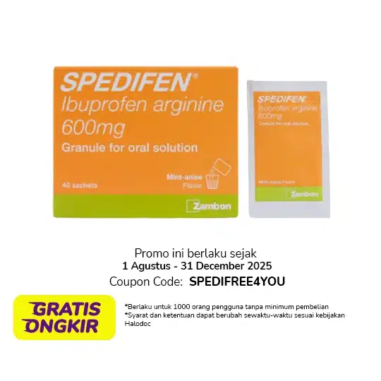 SPEDIFEN tablet selaput film mengandung 600 mg Ibuprogen Arginin merupakan obat golongan NSAID dengan indikasi untuk mengurangi nyeri dari berbagai gejala pada: sakit kepala, nyeri setelah pencabutan gigi serta nyeri pasca operasi. SPEDIFEN juga diindikasikan untuk meredakan tanda dan gejala rheumatoid arthritis dan osteoarthritis, peradangan pada sendi, keram saat haid, dan luka minor. Dalam penggunaan obat ini HARUS SESUAI DENGAN PETUNJUK DOKTER.