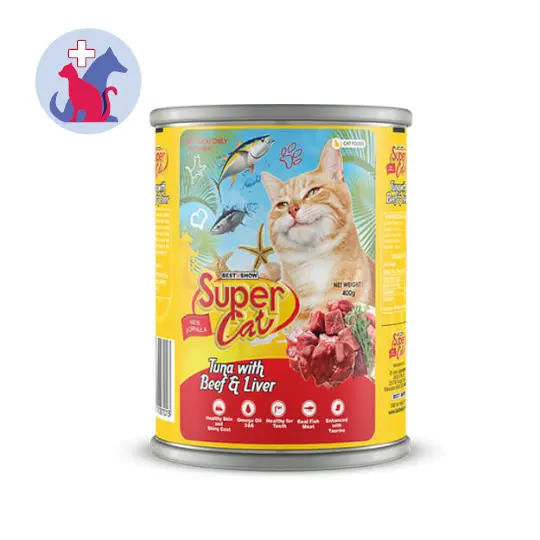 SUPER CAT ADULT TUNA WITH BEEF & LIVER merupakan makanan untuk kucing dewasa. Makanan ini terbuat dari ikan tuna dengan daging dan hati sapi.