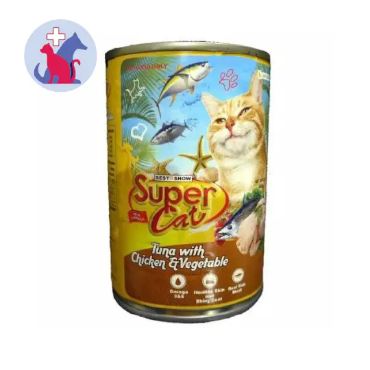 SUPER CAT ADULT TUNA WITH CHICKEN & VEGETABLE merupakan makanan basah khusus untuk kucing dewasa. Makanan ini terbuat dari ikan tuna dengan daging ayam dan sayur-sayuran.