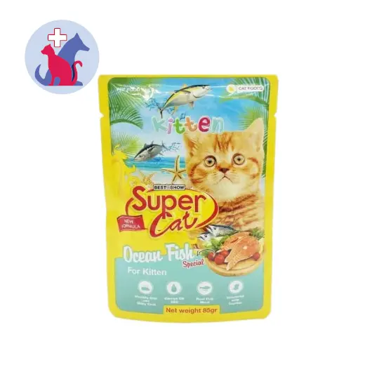 SUPER CAT KITTEN OCEAN FISH SPECIAL CAT FOODS merupakan makanan yang ideal dikonsumsi untuk anak kucing. Makanan ini diolah dari ikan laut pilihan yang optimal untuk perkembangan dan pertumbuhan anak kucing.