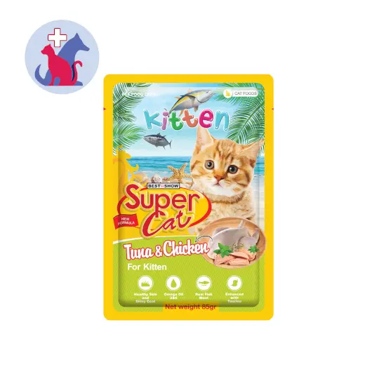 SUPER CAT KITTEN TUNA & CHICKEN CAT FOODS merupakan makanan yang ideal dikonsumsi untuk anak kucing. Makanan ini diolah dari ikan tuna dan daging ayam pilihan untuk kesehatan tubuh, kulit dan bulu anak kucing.