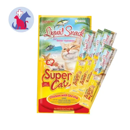 SUPER CAT LIQUID SNACK CHICKEN WITH SHRIMP merupakan camilan kucing berbentuk cair dengan rasa ayam dan udang.