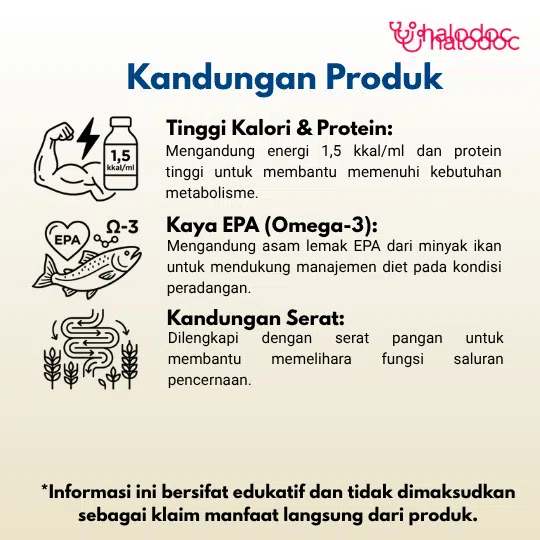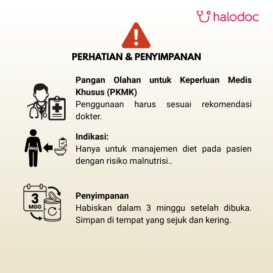 Produk ini merupakan pangan olahan keperluan medis khusus untuk dukungan bagi pasien dewasa malnutrisi.Penggunaan produk ini harus dengan rekomendasi dokter