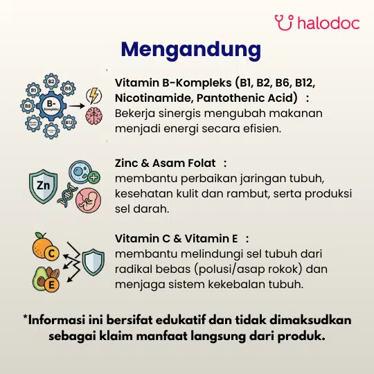 Per-tablet : Vit.E 30 iu, vit.C 750 mg, Folic acid 400 mcg, vit.B1 15 mg, vit.B2 15 mg, Niacin 100 mg, vit.B6 20 mg, vit.B12 12 mcg, Pantothenic acid 20 mg, Zn 22.5 mg
