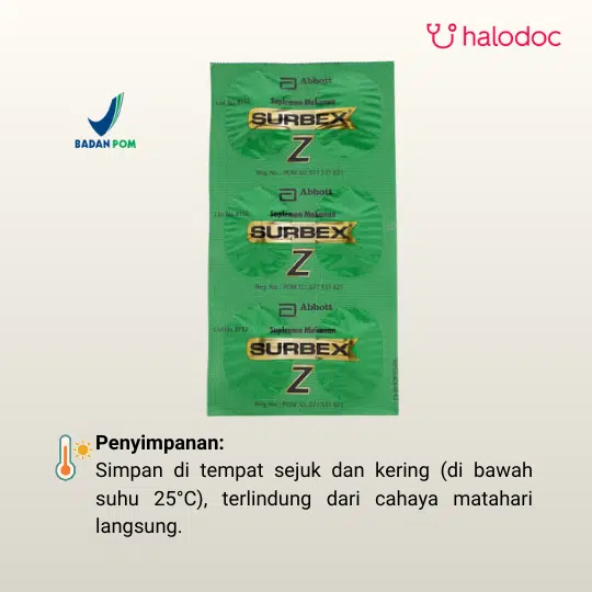 Surbex-Z adalah suplemen multivitamin dan mineral yang mengandung vitamin B kompleks, vitamin C, vitamin E, asam folat, kalsium pantotenat, dan zinc. Suplemen ini digunakan untuk membantu memenuhi kebutuhan vitamin B, vitamin C, vitamin E, dan zinc, terutama pada kondisi defisiensi. Suplemen ini digunakan untuk membantu memelihara stamina tubuh.