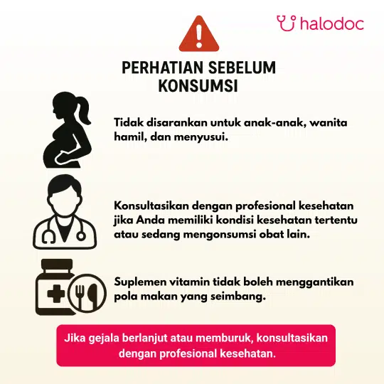 Jika Anda sedang hamil, menyusui, atau dalam kondisi kesehatan khusus, konsultasikan dengan dokter sebelum menggunakan produk ini. Suplemen vitamin sebaiknya tidak menggantikan asupan yang seimbang. Jauhkan dari jangkauan anak-anak. Simpan pada suhu di bawah 30°C. Jangan digunakan bila segel rusak.