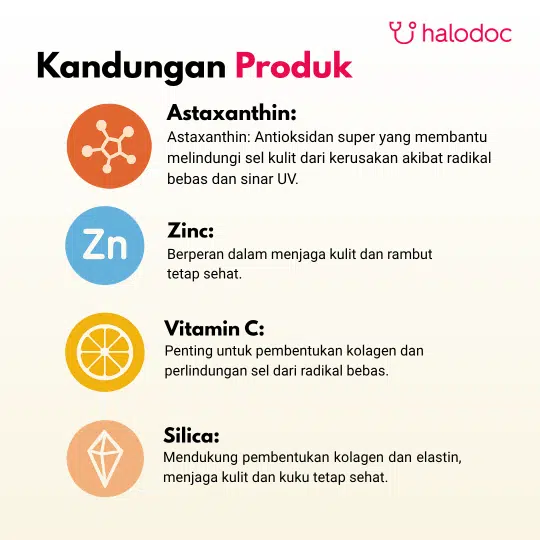 Produk ini mengandung Vitamin C yang membantu pembentukan kolagen yang normal untuk fungsi kulit. Vitamin E dan Seng berperan sebagai antioksidan yang membantu meredam radikal bebas. Kombinasi nutrisi lainnya seperti Biotin, Nicotinamide, dan asam amino (L-proline, Glycine, Lysine Hydrochloride) serta ekstrak biji anggur (Vitis vinifera) juga disertakan untuk melengkapi formulasi dalam mendukung kesehatan kulit.