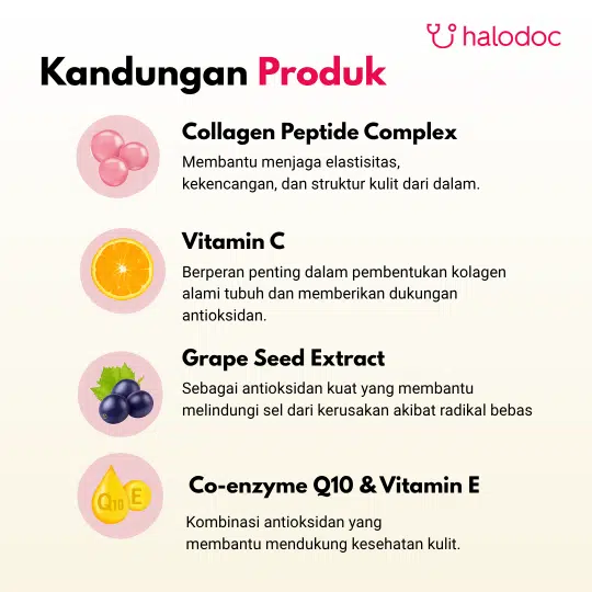 Tiap tablet salut selaput mengandung: Hidrolisat Kolagen 834 mg, Vitamin C 83.33 mg, Vitamin E (sebagai D-alpha-Tocopheryl acid succinate) 3.672 IU, Tembaga (sebagai Cupric oxide) 0.142 mg, Co-enzyme Q10 15 mg, Ekstrak biji anggur (Vitis vinifera) 6.95 mg.