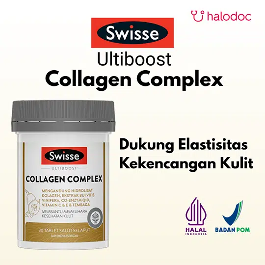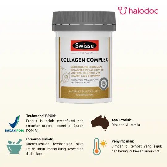 SWISSE ULTIBOOST COLLAGEN COMPLEX diformulasikan dari kolagen, ekstrak biji anggur, co-enzyme Q10, vitamin C, vitamin E, dan tembaga untuk membantu memelihara kesehatan kulit.