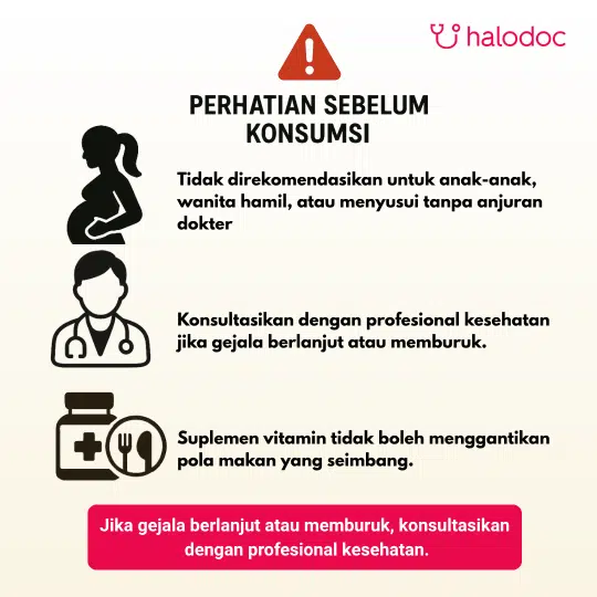 Jika tidak ada perbaikan gejala, segera hubungi dokter. Minum banyak air, setidaknya 2 liter per hari. Simpan pada suhu di bawah 30°C di tempat yang kering dan terlindung dari sinar matahari langsung. Jangan digunakan bila segel rusak. Produk ini mengandung kedelai dan sulfit.