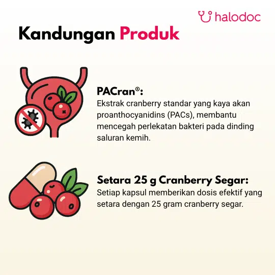 *Informasi ini bersifat edukatif dan tidak dimaksudkan sebagai klaim manfaat langsung dari produk. Produk ini mengandung Pacran, sebuah bentuk serbuk unik dari buah cranberry (Vaccinium macrocarpon). Cranberry kaya akan antioksidan, terutama proanthocyanidins (PACs), yang secara tradisional digunakan untuk membantu mendukung kesehatan saluran kemih.